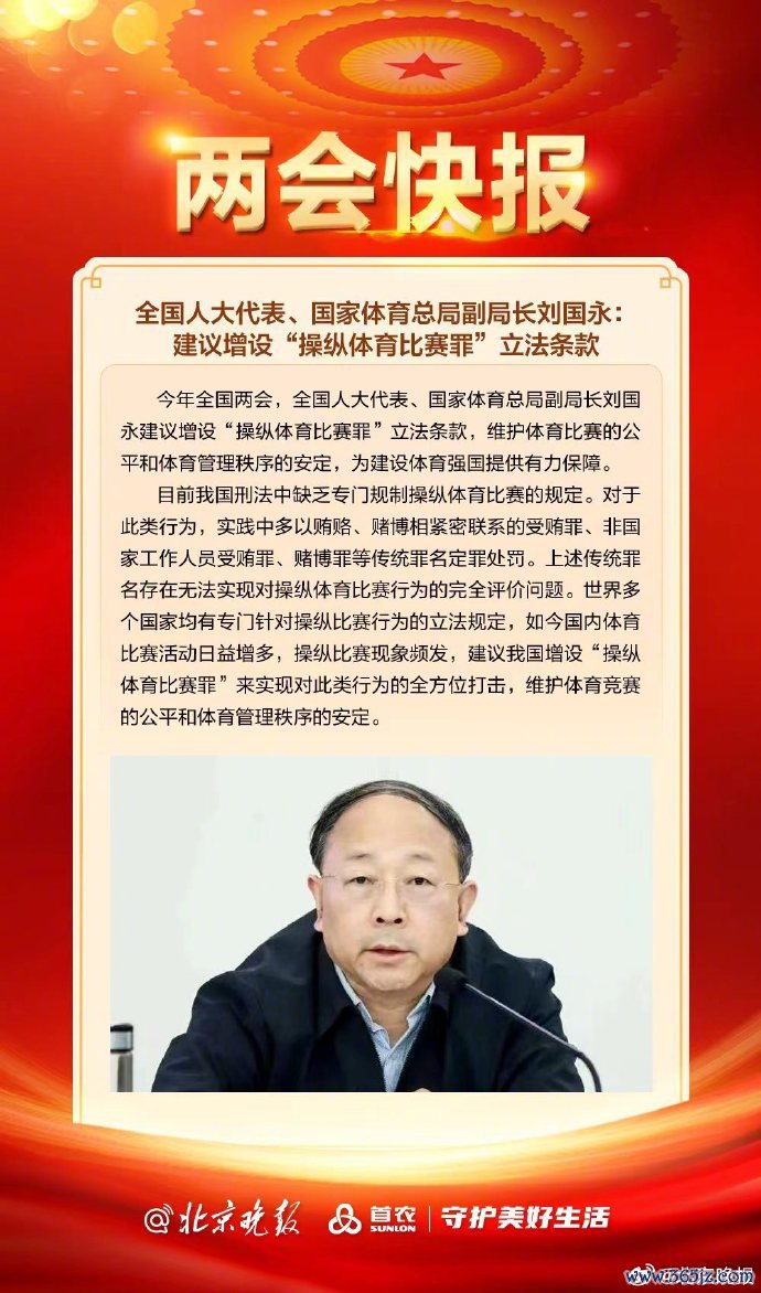 本年世界两会,世界东谈主大代表、国度体育总局副局长刘国永淡薄增设主宰体育比赛罪立法要求,爱戴体育比赛的公平和体育解决治安的妥当,为竖立体育强国提供有劲保险。